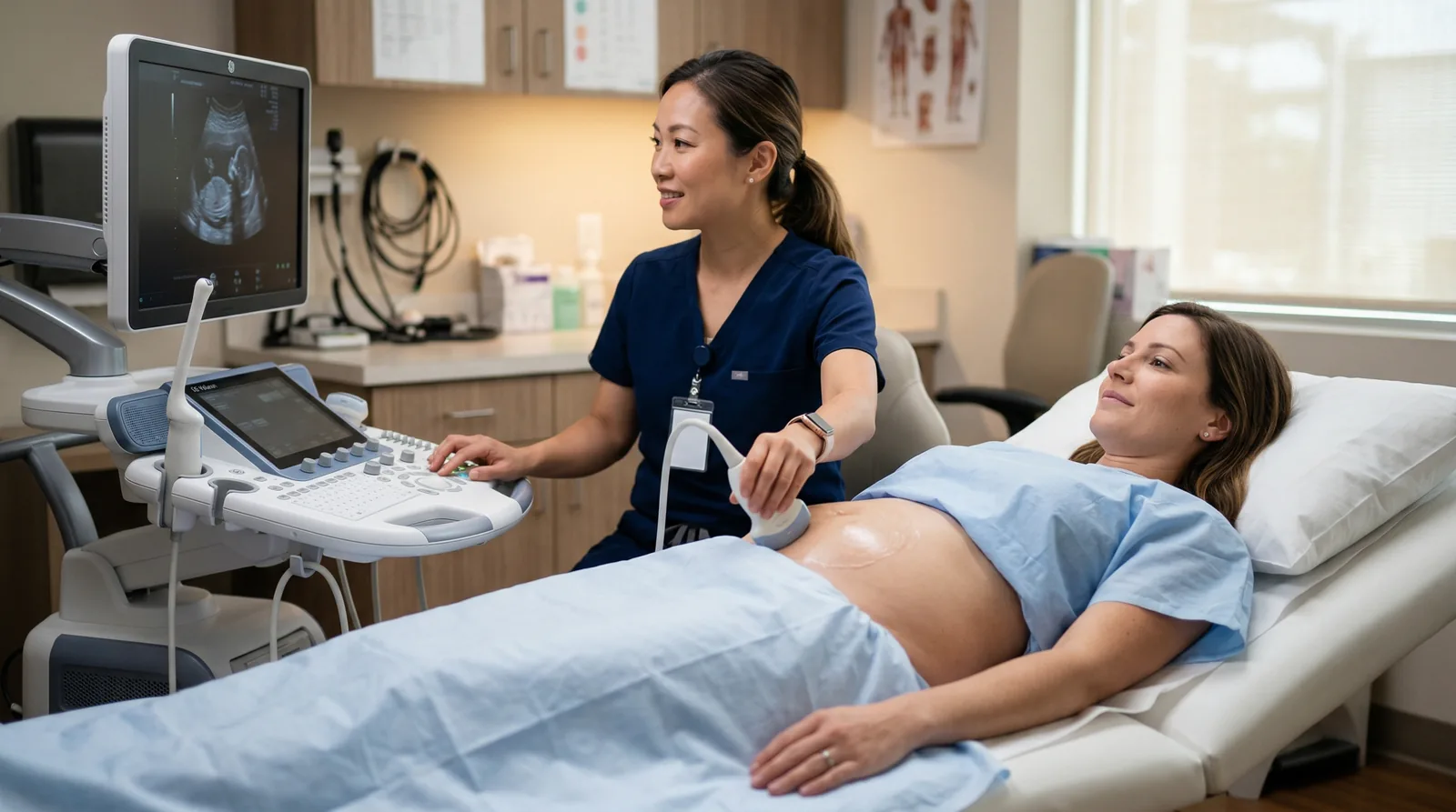 Examinarea propriu-zisă durează de obicei între 15 și 30 de minute, în funcție de complexitatea cazului. Este o procedură nedureroasă, în care veți simți doar presiunea ușoară a sondei ecografice pe abdomen.